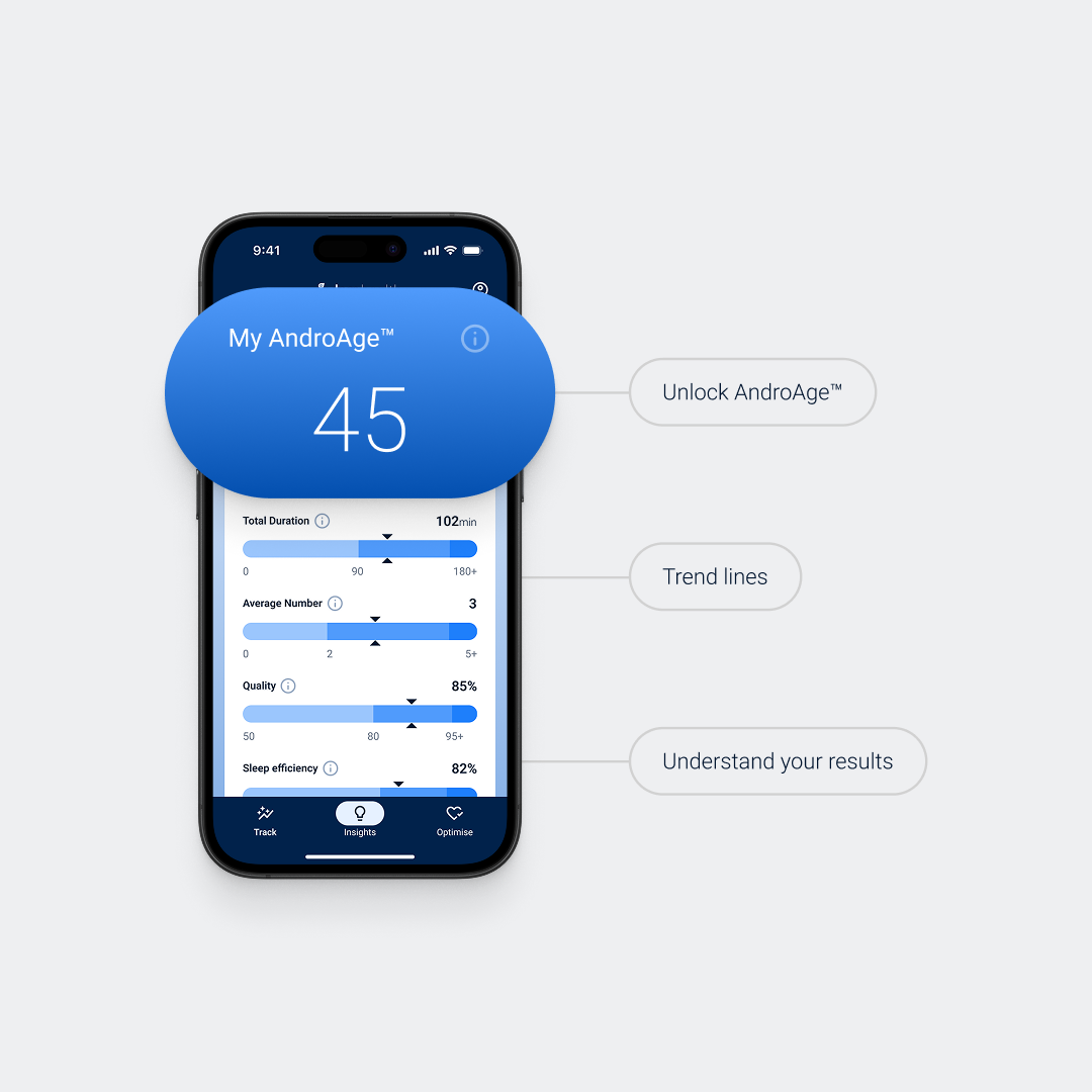 AndroAge™ provides a unique insight into your erection, vascular and hormone health through an estimated score. It measures the total duration and frequency of your nightly erections and compares it to reference data from an independent, peer-reviewed clinical study of healthy men aged 20-75+. The result is a personalised estimate, showing you at a glance if your nocturnal patterns reflect a younger or older physiological age than average.