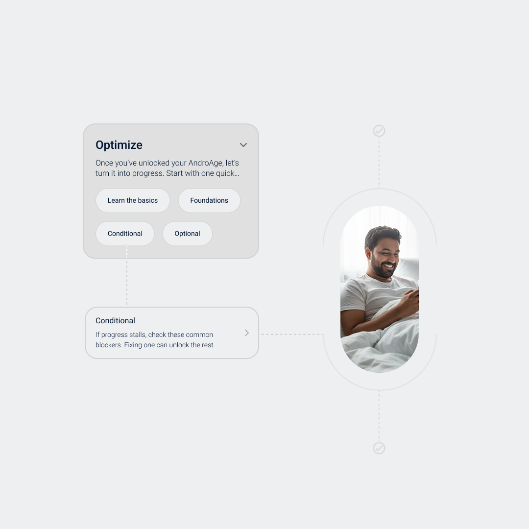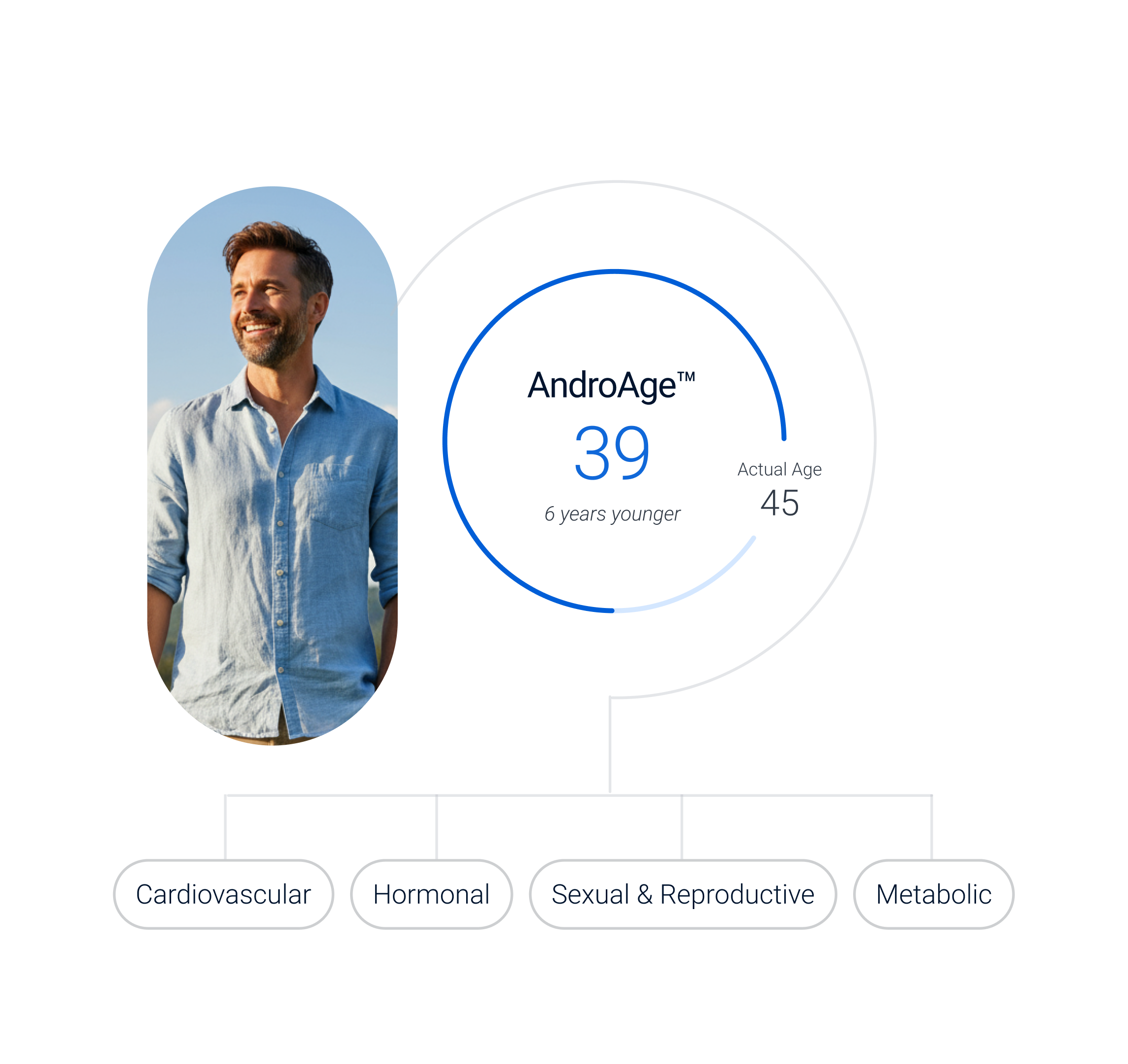 Through the Adam App, this data is translated into your AndroAge™, your biological performance age, a single, science-based score that reflects how well your body is truly functioning across systems.